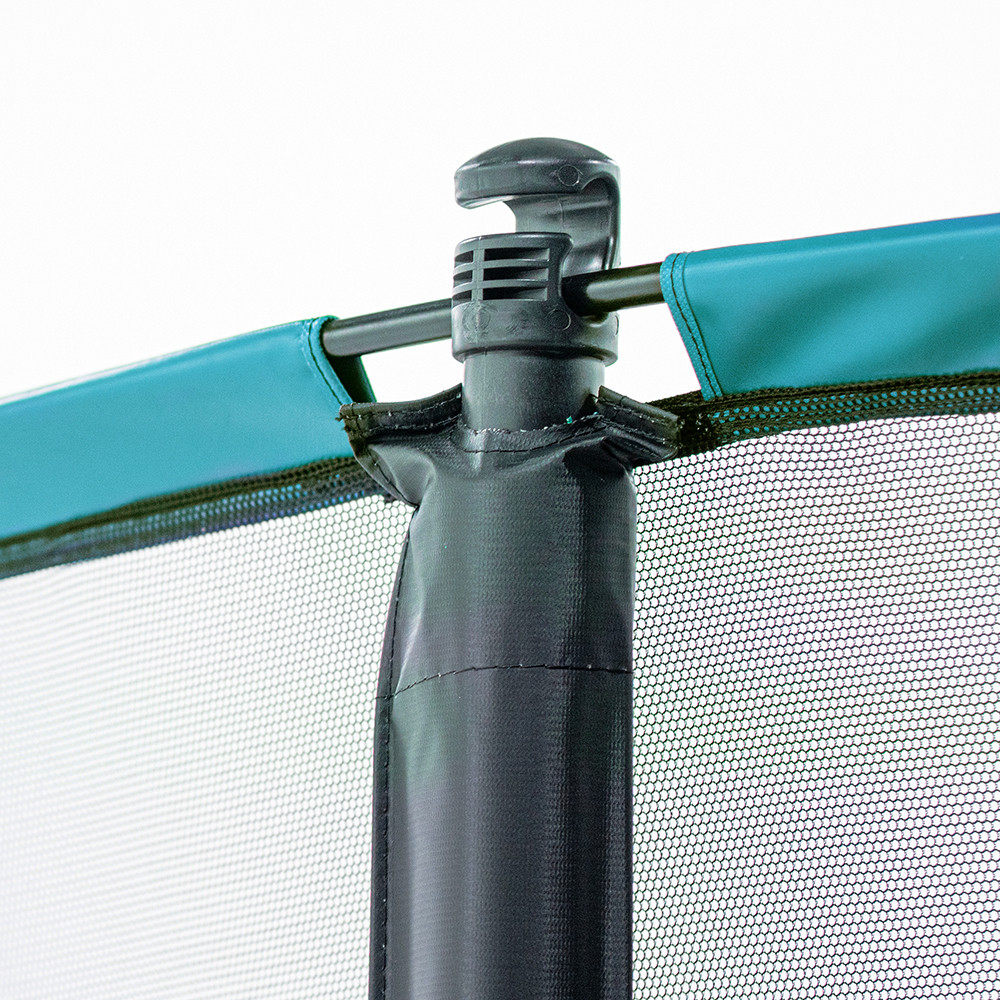 - The bottom of the net is fixed to the trampoline thanks to elastic straps with clips, that are hooked onto the spring rings. The permanent tension of the net will stop users from falling between the net and the frame pad. The net is placed between the net posts and the frame pad allowing jumpers to make the most of all of the jumping mat.